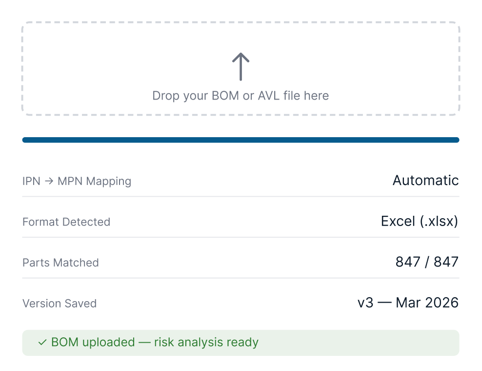 Upload your BOM and automatically surface obsolescence, compliance gaps, and supplier risk — no manual work.