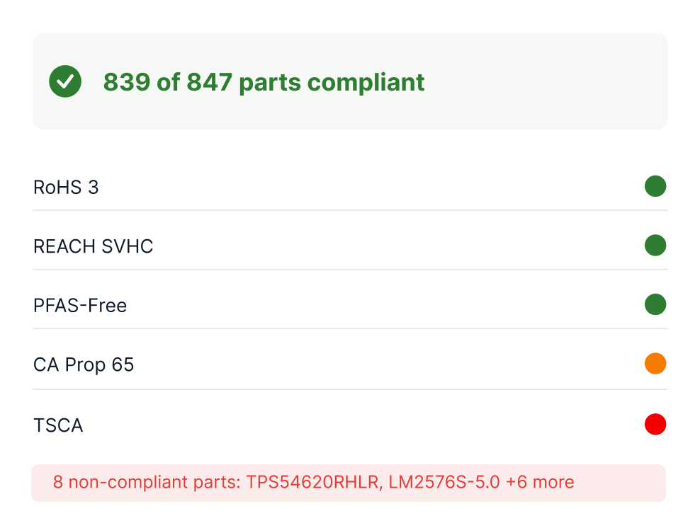 Check your BOM against 100+ global regulations — RoHS, REACH, PFAS, and more — automatically.