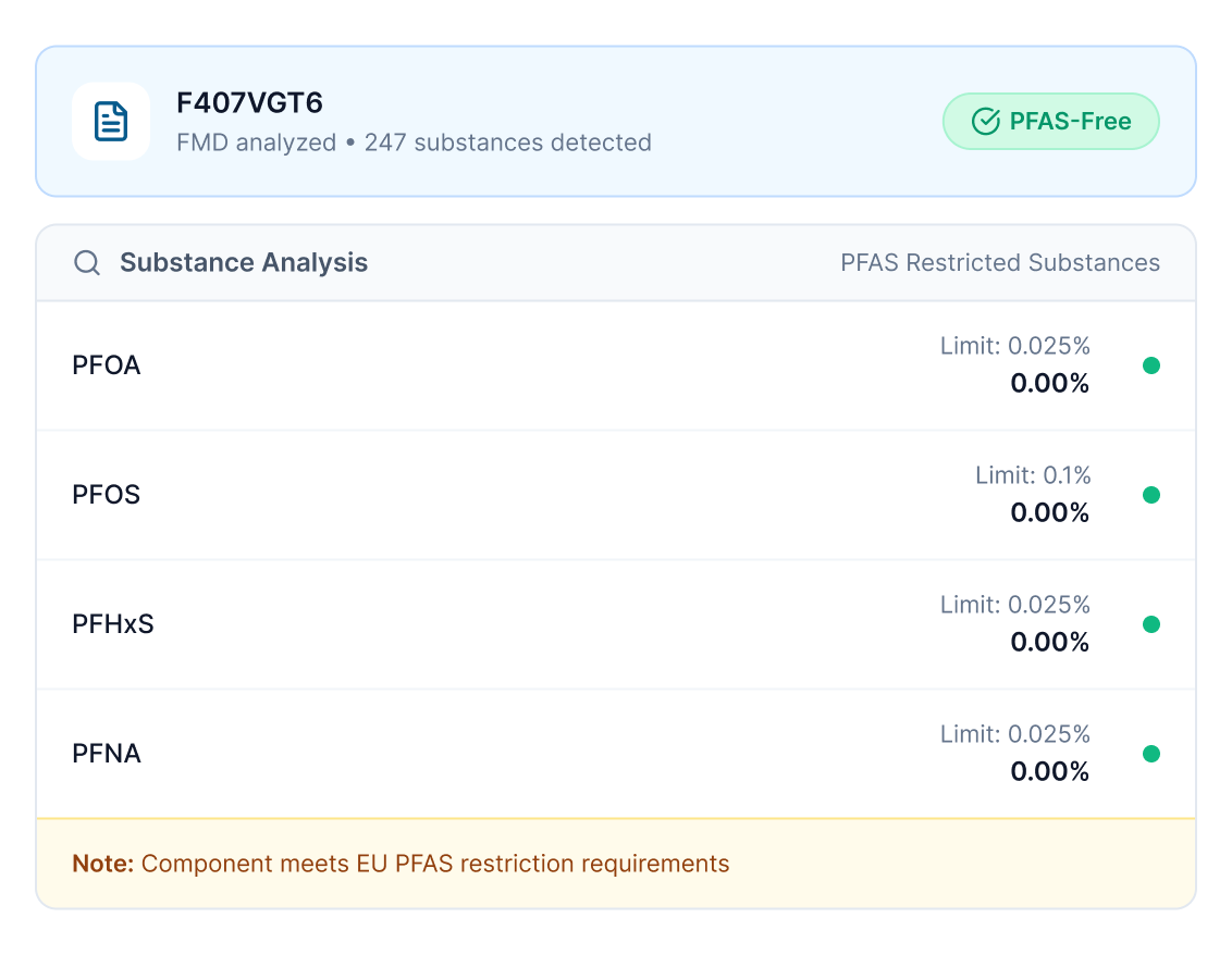 - FMD-based compliance status for PFAS, REACH, RoHS, China RoHS, and SCIP