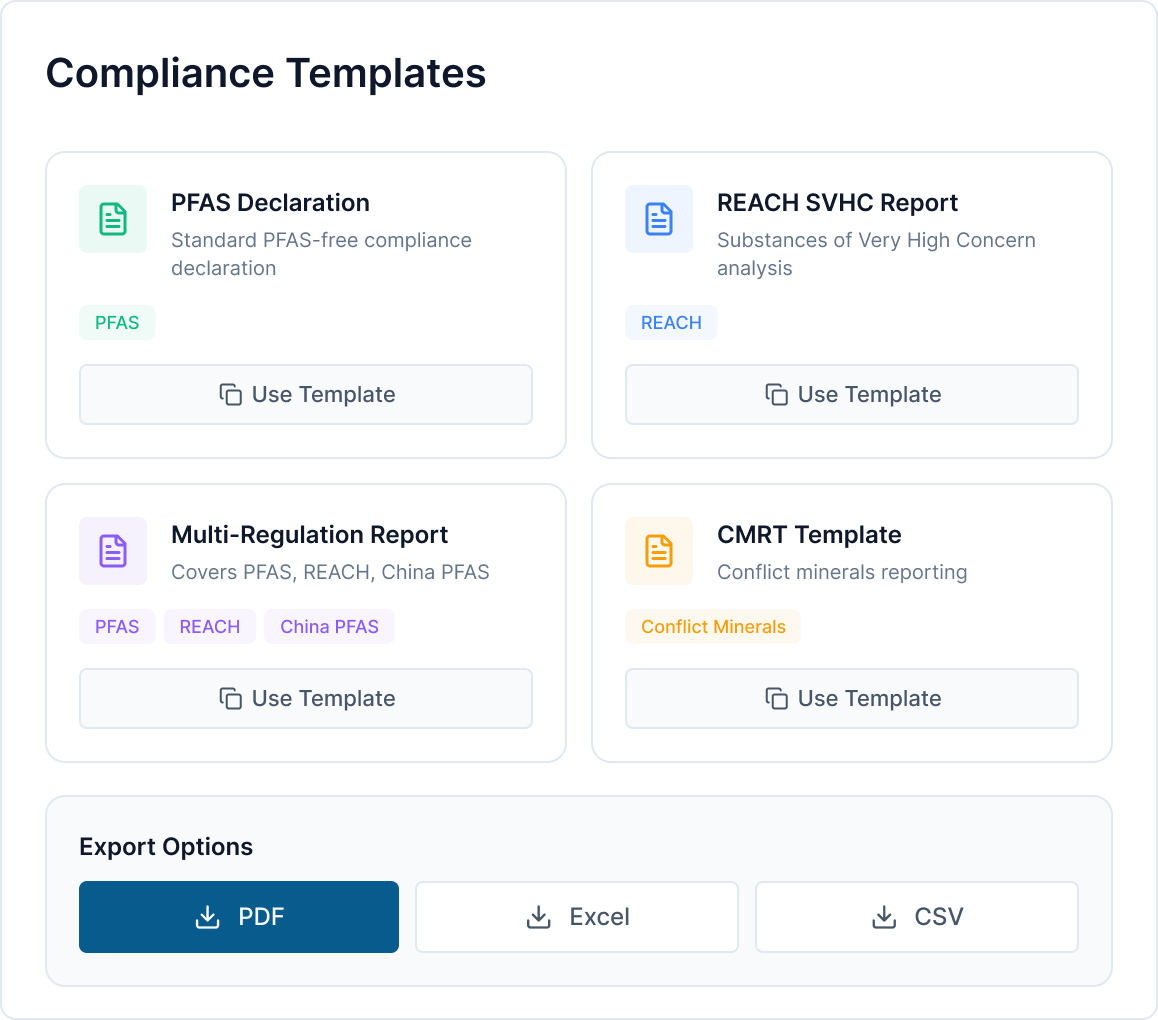 Once your product is compliant, generate and export product-level compliance templates for PFAS, RoHS, REACH, China RoHS, Conflict Minerals, and more. Easily import into any PLM or ERP system.