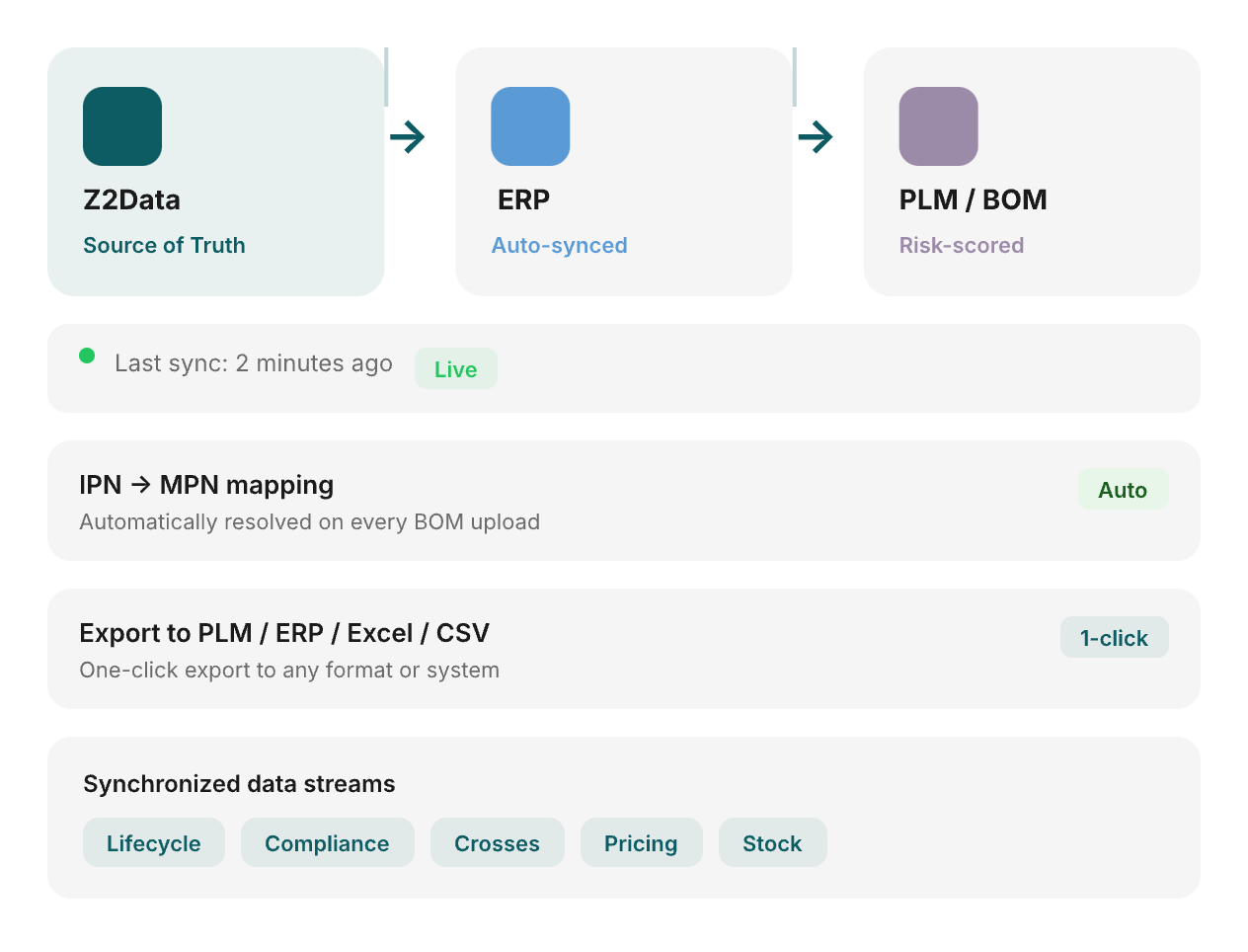 Yes. Z2 integrates directly with leading ERP and PLM platforms and supports export to Excel, CSV, and XML. Upload unlimited BOMs with version histories and get risk scores automatically.