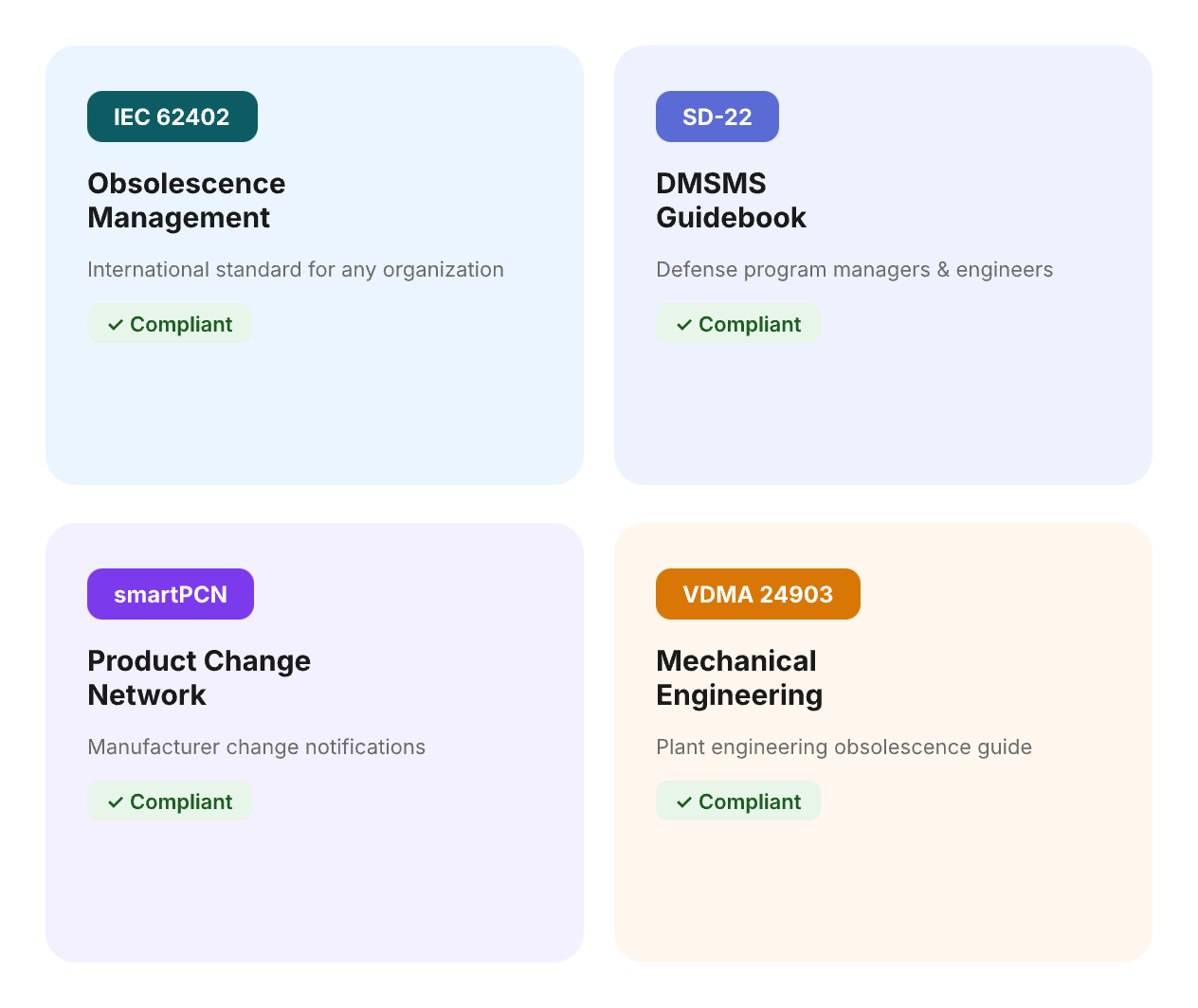 Z2 is built in accordance with IEC 62402:2019, SD-22, smartPCN, and VDMA 24903 — the key international standards for obsolescence management across defense, aerospace, industrial, automotive, and medical sectors.
